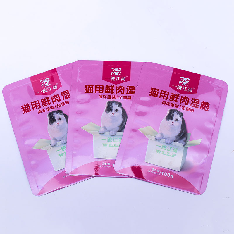 Features:Pet food packaging has a variety of forms, for different specifications of pet food packaging. The quality of pet food packaging directly affects the quality of pet food. Pet food packaging bags are based on the characteristics of the package of pet food to determine the bag type and packaging materials used! Pet fresh wet food packaging is generally used can be 121 degrees of high temperature sterilization packaging material! Pet puffed products snacks, generally used room temperature packaging! The color printing design of the packing bag and the bag type of the packing bag can be customized according to the customer requirement.
